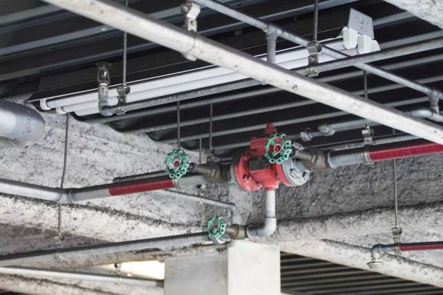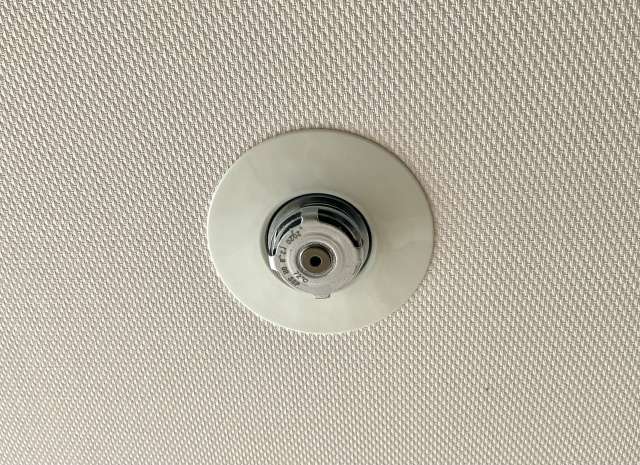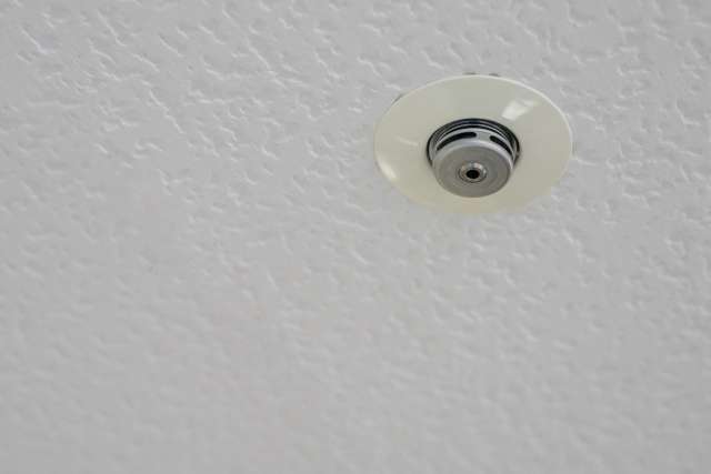 スプリンクラーは、火災の熱を感じ取って自動で水を出す設備です。天井の配管から水が送られ、火の気配を感知したヘッド(先端部分)が作動して放水します。人がいなくても作動するため、火が広がる前に消火できるのが大きな特徴です。オフィスや施設では、一定の広さや高さを超えると設置が求められることがあり、これは消防法で定められています。